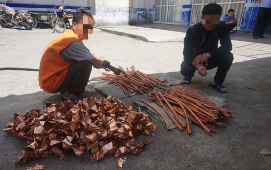5月10日,城内派出所接县电力局施工队人员报警称其位于西乡县锦雅酒店停车场旁的一个在建变电箱内的20余米长的电缆被盗,价值约2万余元。接警后,处警民警会同技术队民警对现场进行了勘验调查,并根据周围监控锁定了2名盗窃嫌疑人。上案民警在嫌疑人出租屋周围进行蹲点守候,5月14日凌晨3时许,布控民警发现2名嫌疑人骑三轮车从外面回来并将两袋可疑物抬进房内,随即民警对二人进行盘问并对住房进行检查,当场查获电缆铜芯线、铜皮三袋等赃物及钢锯、大力钳等作案工具。