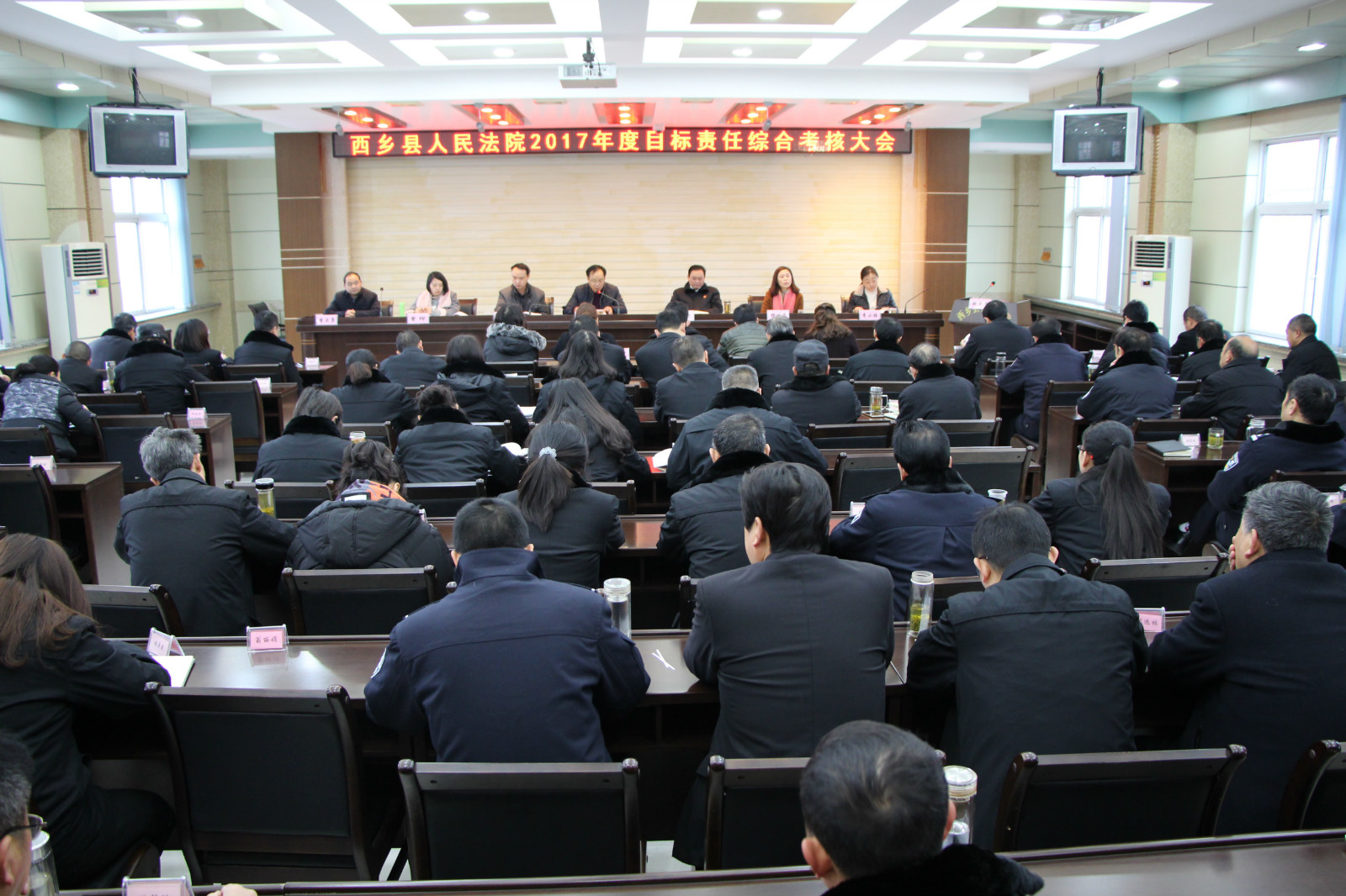 1月4日上午,西乡法院召开2017年度目标责任综合考核大会,以县委组织部副部长程晓兵为考核组组长的一行六人对全院2017年度岗位目标任务完成情况进行全面考核。院机关全体工作人员及各基层法庭负责人参加会议。